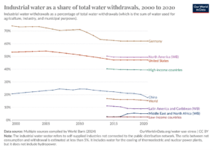 Estimating the exact amount of water withdrawn by industry is challenging – in the U.S., for example, water used by industry is often self-supplied and thus largely unregulated. However, global estimates show that in 2024, industrial water withdrawals comprised nearly 20% of global water withdrawals, surpassing municipal demand.